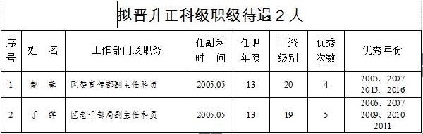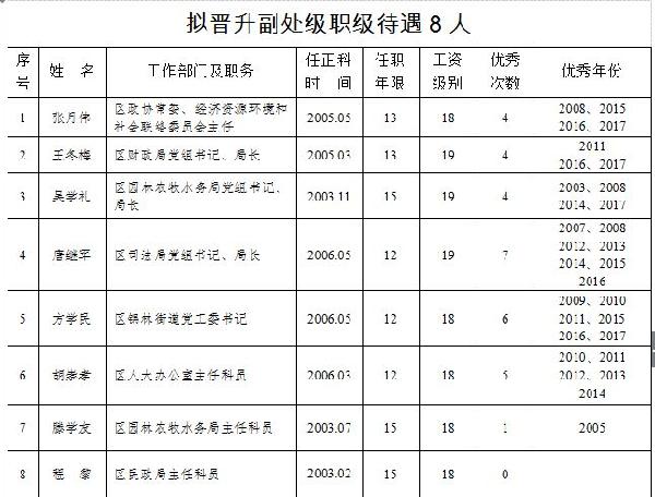 以上拟晋升职级待遇干部的公示时间为2018年11月23日至2018年11月29日。公示期间,如对相关信息存疑或有遗漏的,请及时与区委组织部129办公室联系(联系人:刘榴 联系电话:2026919)。