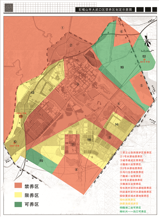 按照大武口区城市建设规划、工业用地规划、水源地保护规划和生态环境保护区规划,将下列地区划定为限制养殖区:一是长胜街道办事处,地处工业用地规划区,划定为长胜限养区。二是星海镇十四支渠以北的地区。星海镇十四支渠以北是城市发展规划区和工业用地规划区,划定为星海镇限养区。具体位置和范围见附图。