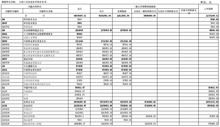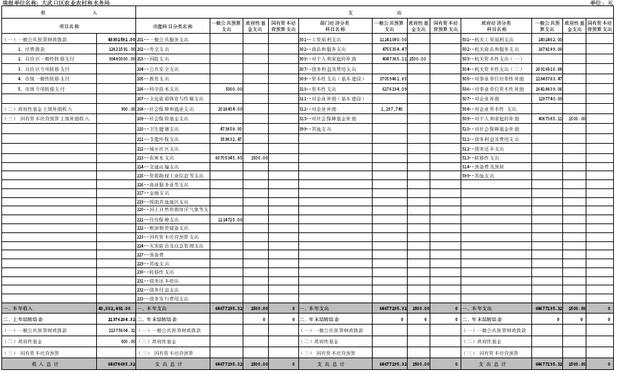 大 武 口 区 农 业 农 村 和 水 务 局 2026 年 收 入 总 预 算64678695.32 元,其中:本年收入 43302491.00 元,上年结转结余 21376204.32 元;支出总预算 64678695.32 元,其中:本年支出 43302491.00 元,年末结转结余 21376204.32 元。