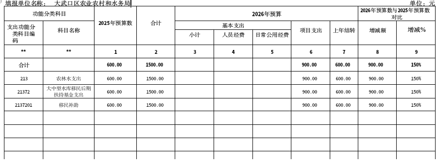 1、农林水支出(213)大中型水库移民后期扶持基金(21372)移民补助(2137201)2026 年预算900.00 元,上年结余结转600.00元,共计 1500.00 元。比 2025 年执行数增加 900.00 元,增长150 %。主要用于大武口区大中型水库移民后期扶持直补资金, 增加移民人均可支配收入 200.00 元。
