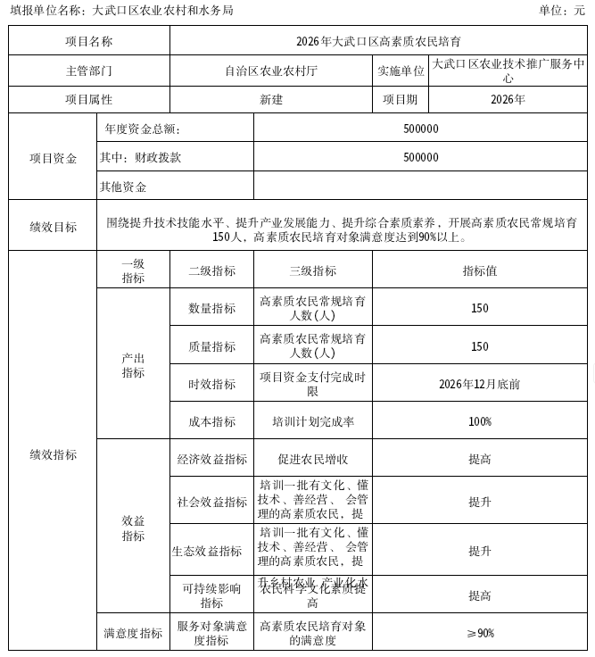 4、2026 年高素质农民培育项目,农林水支出(213)农业农村(21301)农村合作经济(2130124)2026 年预算 500000.00 元。主要用于围绕提升技术技能水平、提升产业发展能力、提升综合素质素养,开展高素质农民常规培育 150 人,高素质农民培育对象满意度达到 90%以上。