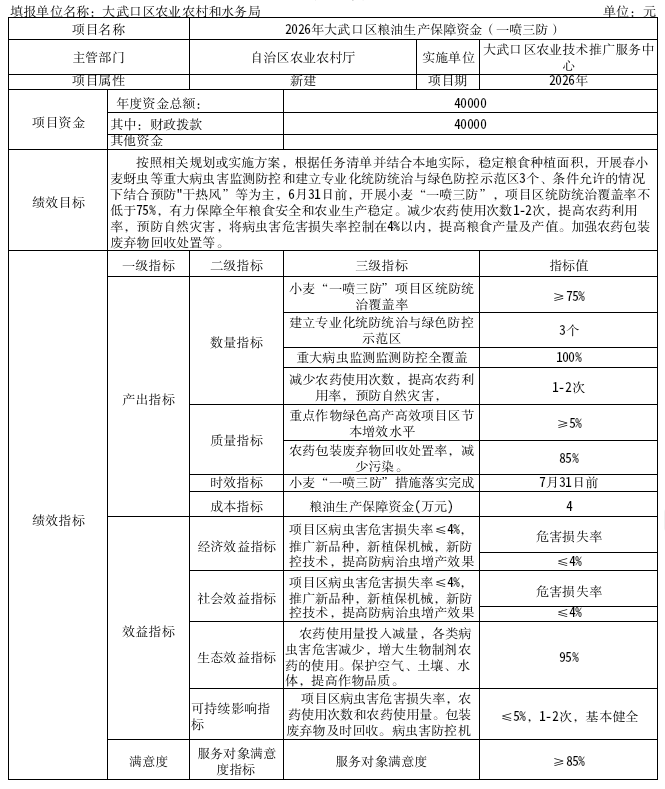6、小麦“一喷三防”防控项目,农林水支出(213)农业农村(21301)农业生产发展(2130122)2026 年预算 40000.00 元, 主要用于大武口区春小麦、水稻、玉米等主要农作物重大病虫害疫情防控工作,保障粮食安全和农业生产安全。绩效目标:开展春小麦蚜虫等重大病虫害监测防控和建立专业化统防统治与绿色防控示范区、结合预防"干热风”等为主,减少农药使用次数1-2 次,提高农药利用率。预防“干热风”造成的损失,防止植株早衰,籽粒空瘪,提高产量。