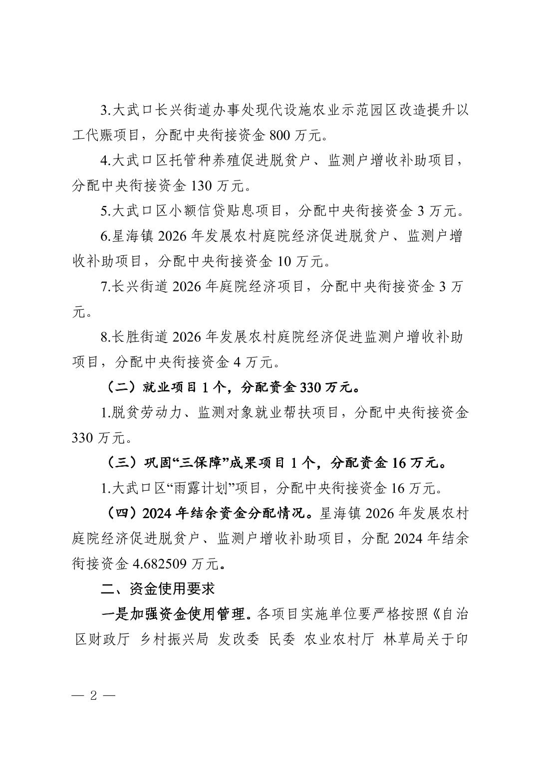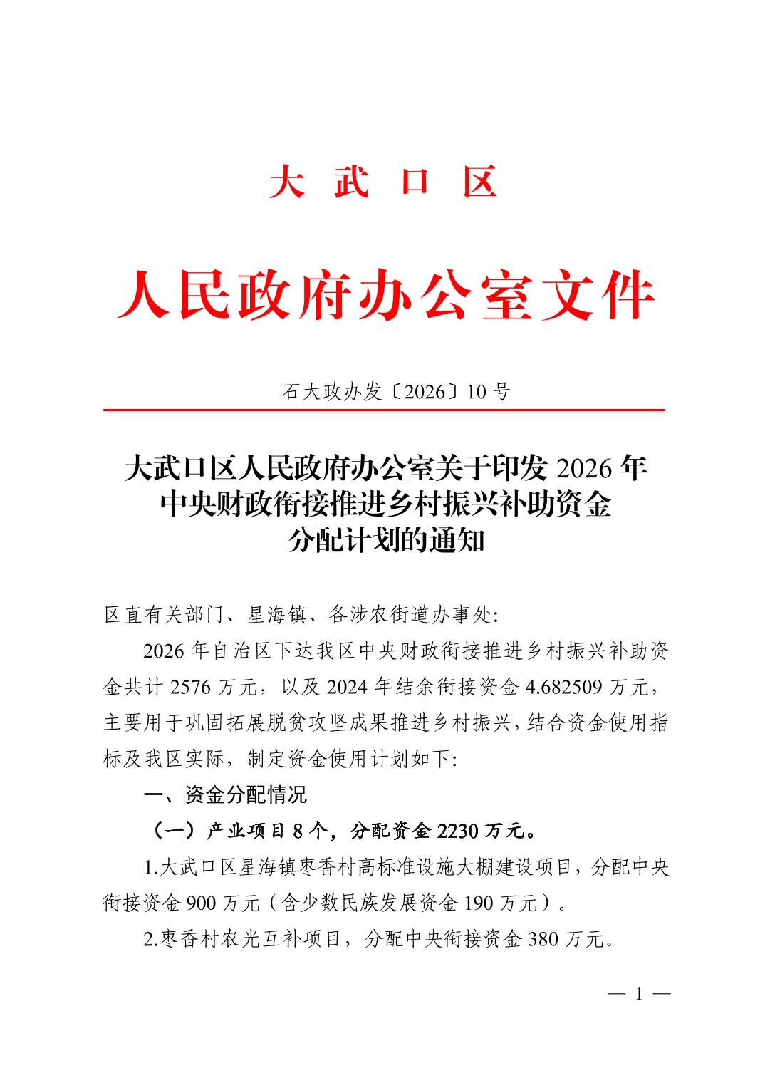 大武口区人民政府办公室关于印发2026年中央财政衔接推进乡村振兴补助资金分配计划的通知